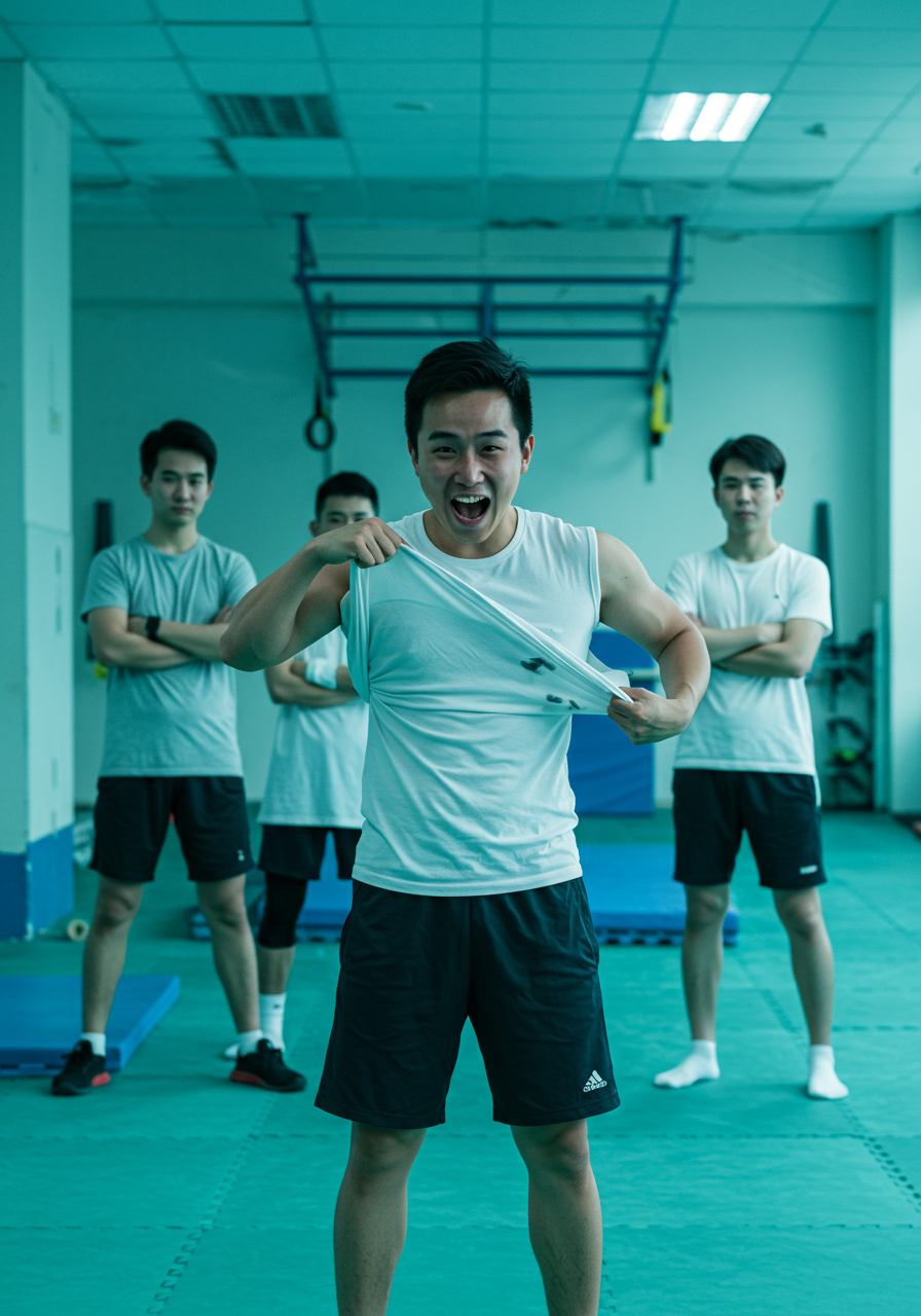 "낙법 시범 들어갑니다!" 당당하게 외친 후 보여준 건, 놀랍게도 그냥 평범한 앞구르기. 그나마 균형도 제대로 안 잡힌 채 굴렀는데, 구르고 난 뒤 일어나선 헛기침 한 번 하며 “정신 집중이 안 됐네요.” 선배들은 무표정하게 한마디. "그건... 유치원 체육 시간에서나 봤다." 라며 뒤돌아섰죠.