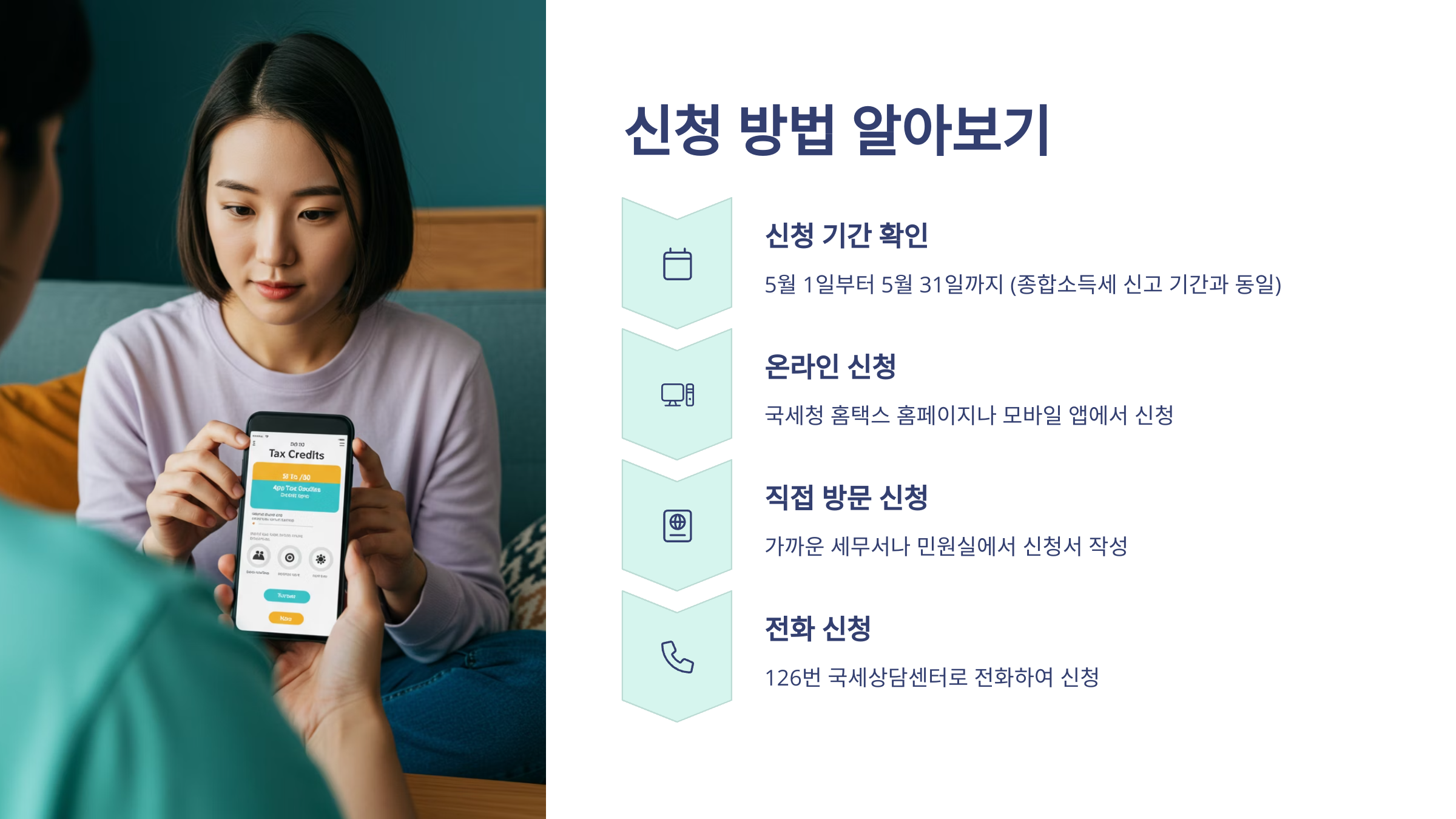 홈택스 외에도 모바일, ARS 등 다양한 방식으로 신청 가능하니 상황에 맞게 선택하세요.