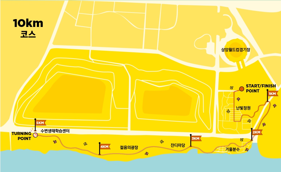 | 10km | 난빛정원 - 젊음의 광장 - 수변생태학습센터 - 복귀 | 경험자, 장거리 도전 러너 |