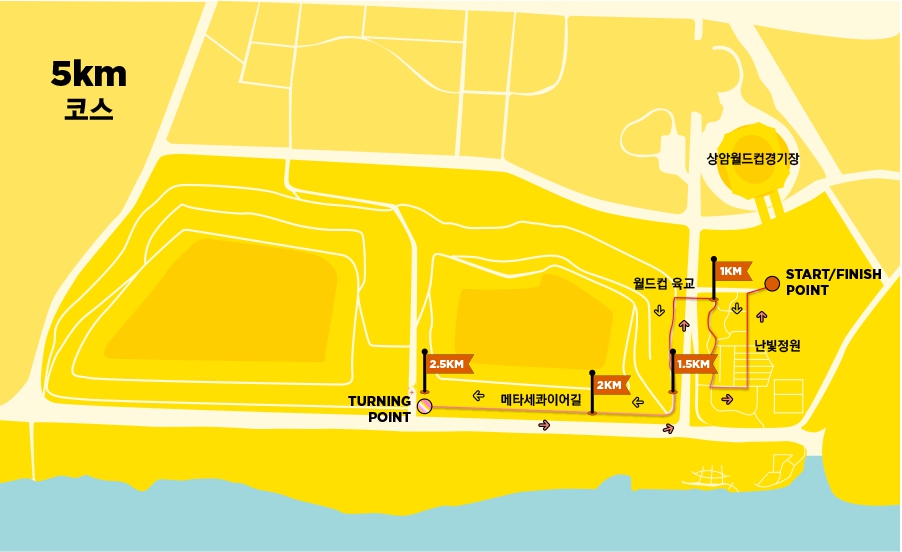 | 5km | 월드컵 육교 - 메타세콰이어길 - 평화의 광장 복귀 | 처음 참가하는 러너, 가족 단위 참가자 |