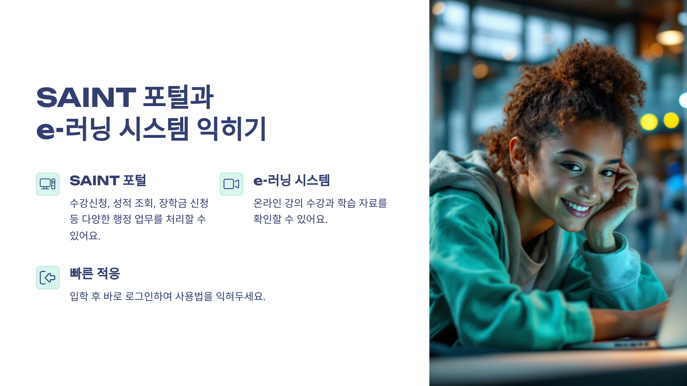 서강대학교의 대표적인 온라인 시스템인 SAINT 포털과 e-러닝 시스템을 잘 활용하면 대학 생활이 훨씬 편리해져요. SAINT 포털에서는 수강신청, 성적 조회, 장학금 신청 등 다양한 행정 업무를 처리할 수 있고, e-러닝 시스템에서는 온라인 강의 수강과 학습 자료를 확인할 수 있어요. 입학 후 바로 로그인하여 사용법을 익혀두세요. SAINT 포털