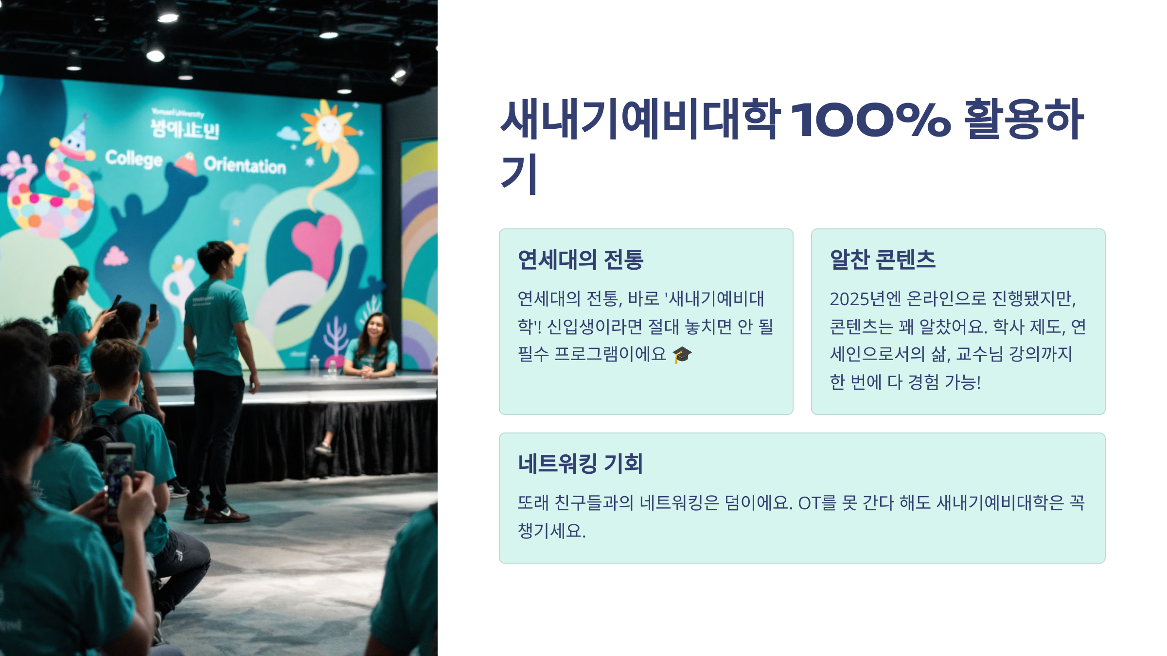 연세대의 전통, 바로 ‘새내기예비대학’! 신입생이라면 절대 놓치면 안 될 필수 프로그램이에요 🎓